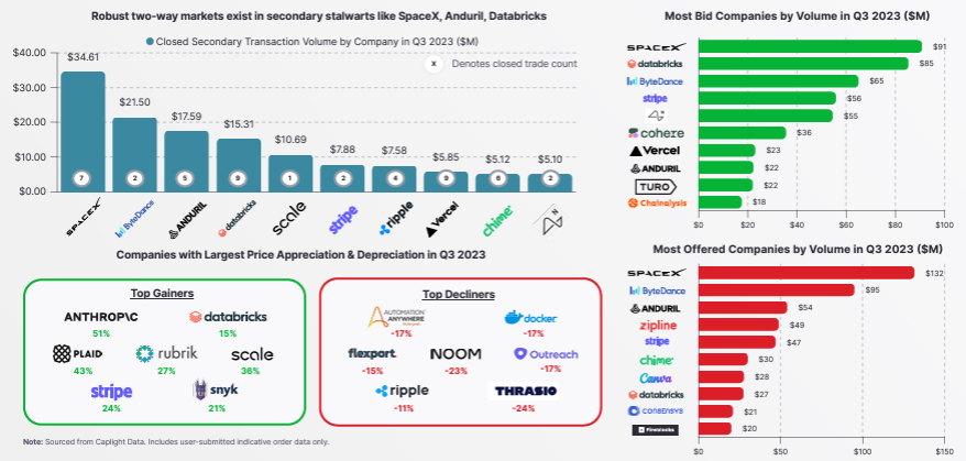 In October of 2023, some institutions came back to the market, indicated by increased trading volume and average deal size. As indicated in the Caplight graphs below, Pre-IPO price performance continues to rebound and trading volume has picked up since the June bottom, with investors looking to take advantage of discounted secondary opportunities.