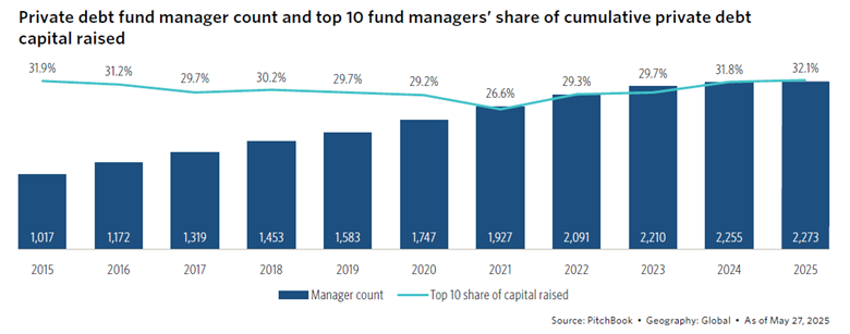 Private debt is having a record-setting year. According to PitchBook, the top 10 private debt managers are on pace to raise 33% of all global capital in 2025. The consolidation of the asset class, fueled by mega fund closes from managers like Ares and Brookfield/Oaktree, marks a turning point: private debt is no longer niche. It’s mainstream.