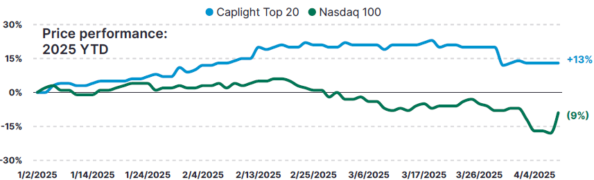 The Caplight Top 20 Index climbed 13 percent year-to-date, outperforming the Nasdaq 100’s 9 percent. Since 2021, the index has delivered an 81 percent gain, compared to 51 percent for the Nasdaq.
