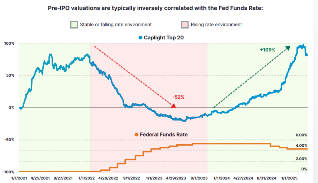 Caplight underscores the inverse relationship between interest rates and private valuations. From early 2022 through mid-2023, rising rates led to a 52 percent decline in pre-IPO valuations. Since rates stabilized in Q3 2023, valuations rebounded 109 percent.