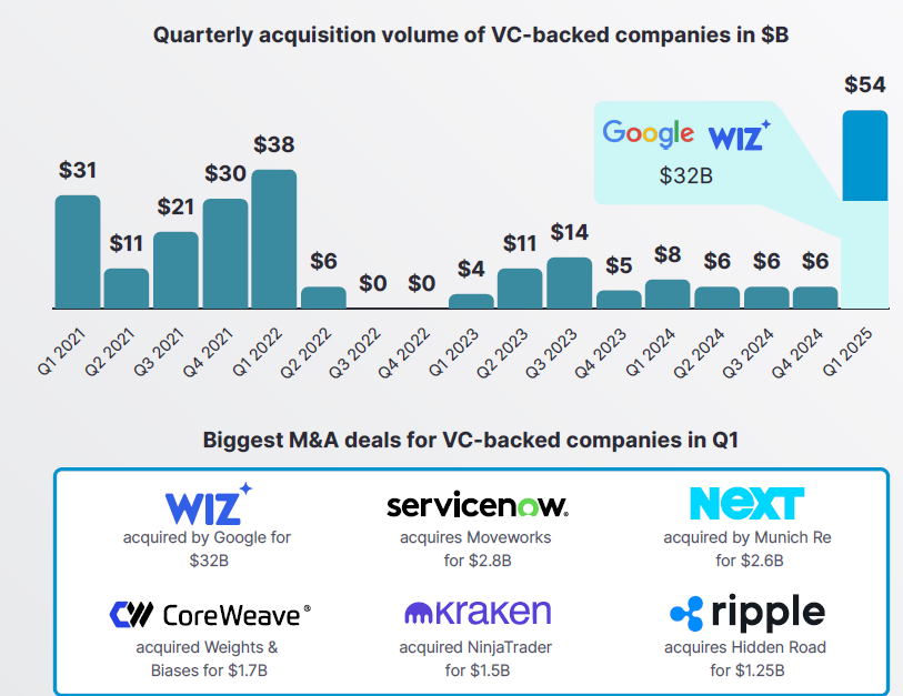 Public market volatility shut the door on several Q1 IPOs, but M&A stepped in with renewed force. Caplight reports $54 billion in venture-backed M&A activity, the highest since 2021. Standout deals included Google’s $32 billion acquisition of Wiz and a flurry of consolidation in crypto and enterprise software.