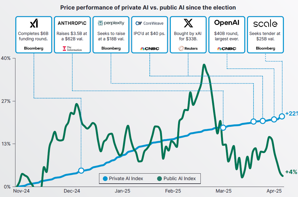 Caplight’s Private AI Index rose 22 percent since the 2024 U.S. election, compared to 4 percent for the Public AI Index. Institutional capital is favoring private AI companies with specialized models, high margins, and rapid scaling potential.