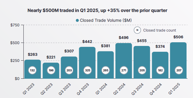 Private market activity surged in Q1 2025. Caplight reports $506 million in closed secondary trades, up 35 percent quarter-over-quarter. The average transaction size increased by 41 percent, reaching $3 million. Structured trades, including SPVs and forward deals, accounted for nearly half of total volume—evidence of a more institutional, deal-engineered market.