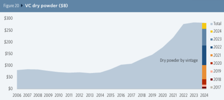 Source: Pitchbook 2025. VC dry powder has held firm at $282.2 billion, while deal volumes remain subdued.